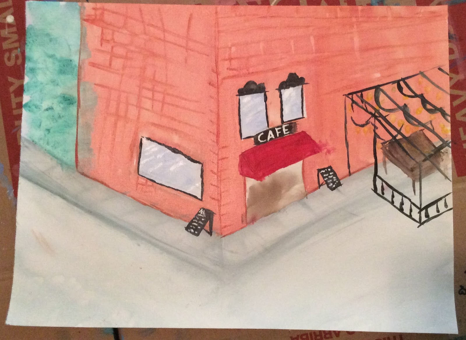 I wanted to paint a little cafe on a street corner. I like how it's turning out so far. Next time I will add more detail.